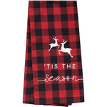 Red Buffalo Check Tis the Season Towel is a soft fabric Christmas towel that will look great displayed in a farmhouse kitchen, or as part of a dining room tablescape. Towel is made of��red and black, buffalo check fabric, and it features the contrasting image of a pair of white deer silhouettes alongside the festive phrase, "'Tis The Season." Measures 27.5" high by 18" wide.