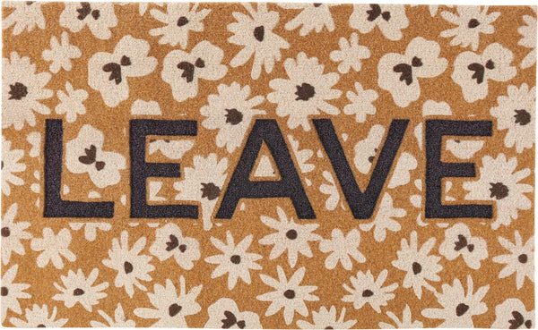 A durable faux coir rug from our Hand Illustrated Collection displaying an engraved sentiment on natural coir background that plays on the idea of "Welcome Mats." Humorous sentiment reads "LEAVE" with floral designs behind it. Faux coir offers the benefit of not shedding over time, unlike natural coir rugs, so the integrity of the design and colors will last longer. Rug can be used indoor or outdoor and features skid-resistant backing to help stay in place. Our Leave rug comes packaged neatly rolled with tag displaying full rug design. A fun everyday home accent. Spot cleaning recommended.
