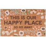 A durable faux coir rug from our Home Collection displaying an engraved sentiment on natural coir background that plays on the idea of "Welcome Mats." Humorous sentiment reads "This Is Our Happy Place - So Go Away" surrounded by flower designs. Faux coir offers the benefit of not shedding over time, unlike natural coir rugs, so the integrity of the design and colors will last longer. Spot cleaning recommended. Rug can be used indoor or outdoor and features skid-resistant backing to help stay in place. Our Happy Place So Go Away rug comes packaged neatly rolled with tag displaying full rug design. A fun everyday home accent that adds functional style.