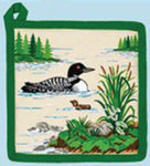 Add a touch of the outdoors to your kitchen with this unique country-style potholder. The Loons hot pad features a serene loon design. It's crafted from 100% cotton for a soft, durable feel. This potholder not only protects your surfaces from hot dishes but also adds a cozy accent to your kitchen.