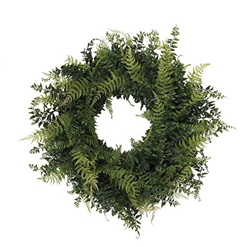 Bring the beauty of the outdoors into your home with this lush green fern and grass wreath. This 24-inch wreath features a vibrant mix of green buckler ferns and grasses. It adds a natural, woodsy vibe to any room. Perfect for rustic or farmhouse decor, this wreath brings a touch of the outdoors inside.