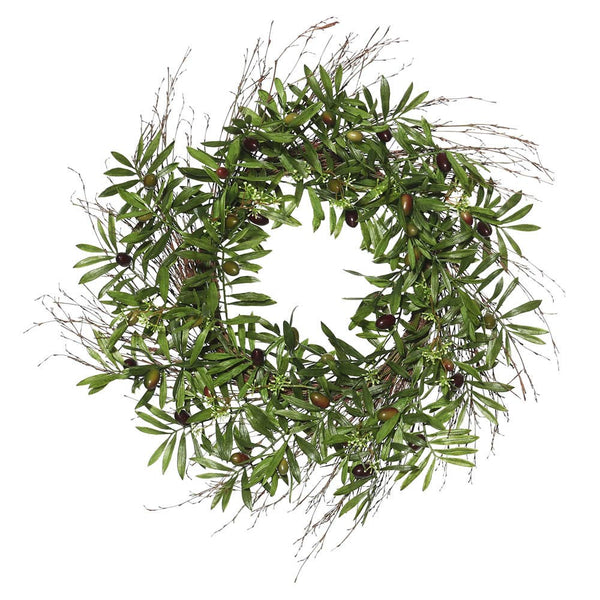 This Green Olive Leaf Wreath will instantly elevate your home d��cor. Imagine the lush beauty of the Mediterranean gracing your front door, or adding a touch of sophistication to your living room. With 42 lifelike olive branches, olives, and delicate white flowers, this beautiful green olive leaf wreath brings nature's beauty indoors with effortless style.
