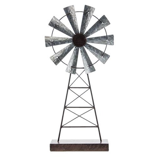 Rustic Windmill Stand is a decorative, galvanized metal windmill on a metal and wood base. Bring the feeling of the rustic outdoors inside the home with this unique piece. Measures 19" high by 8" wide and 3��" deep.