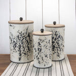 Quietly elegant and boldly practical, the Shibori Flower Nested Canisters by Foreside Home & Garden are a great addition to your home. The gorgeous floral pattern wraps gently around the metal canisters, giving this set of 3 a beautiful and natural essence. - Style: These decorative metal canisters feature a distressed whitewashed shibori floral pattern over a galvanized metal base. - Design: These metal canisters make storing your favorite trinkets and d��cor easy. D��cor use only. - Perfect for your kitchen, living room, bedroom, bathroom, or office Foreside's beautiful home decor will enhance any home style. - Size: Large canister measures 6.75 x 6.75 x 11.75 inches, medium canister measures 5.5 x 5.5 x 10.5 inches, small canister measures 5 x 5 x 9.25 inches