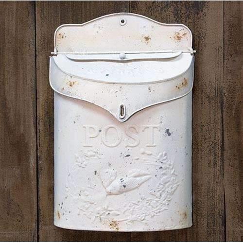 The Shabby White Post Box is a vintage-style metal mailbox with a distressed, white painted finish. Design is embossed with scrollwork details, a bird in flight, and the word "POST" in bold lettering. Mailbox includes a slot for mail as well a hinged top for storing larger items. Includes a pre-drilled hole for hanging. Measures 15��" high by 10��" wide and 3��" deep.